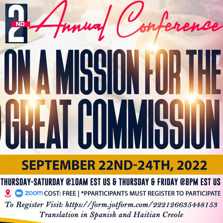 Please join us for this life changing virtual conference. Sept 22nd-24th, 2022, Thursday - Saturday@10am EST US & Thursday and Friday @8pm EST US. An international event where attendees will enjoy bilingual worship, impactful teachings, practical workshops,